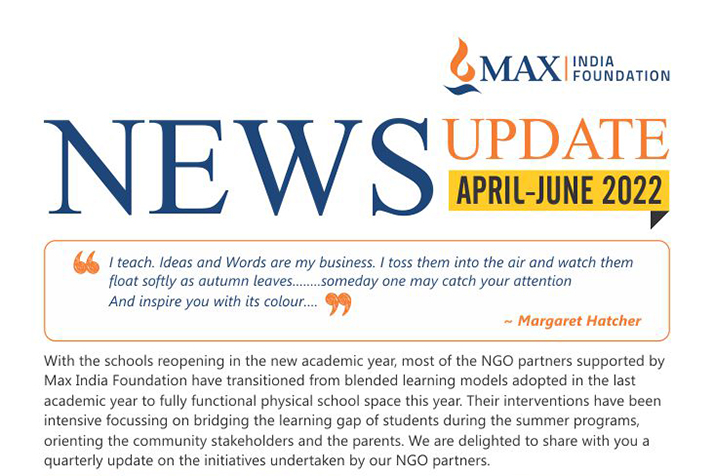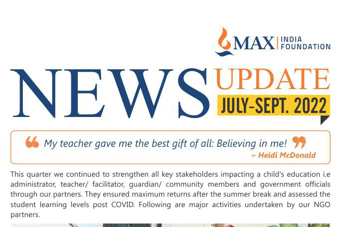 Newsletter Home > Our Updates > Newsletter 2022 Menu Select Year Newsletter 2023 Newsletter 2022 Newsletter 2021 Newsletter 2020 Newsletter 2019 Newsletter 2018 Newsletter 2017 Newsletter 2016 Newsletter 2015 Newsletter 2014 01 Dec Oct-Nov-Dec, 2022 Dipped in the hues of joy and festivity, during this quarter, students gathered together to celebrate Indian festivals…. Click to view 01 Sep Jul-Aug-Sep, 2022 This quarter we continued to strengthen all key stakholders impacting a child’s education…. Click to view 01 Aug Apr, May, June 2022 With the school reopening in the new academic year, most of the NGO partners supported by Max India Foundation…. Click to view 28 April Jan, Feb, March 2023 In the final quarter of the year, students appeared for their final exam….. Click to view Archive Newsletters Click to View Archives